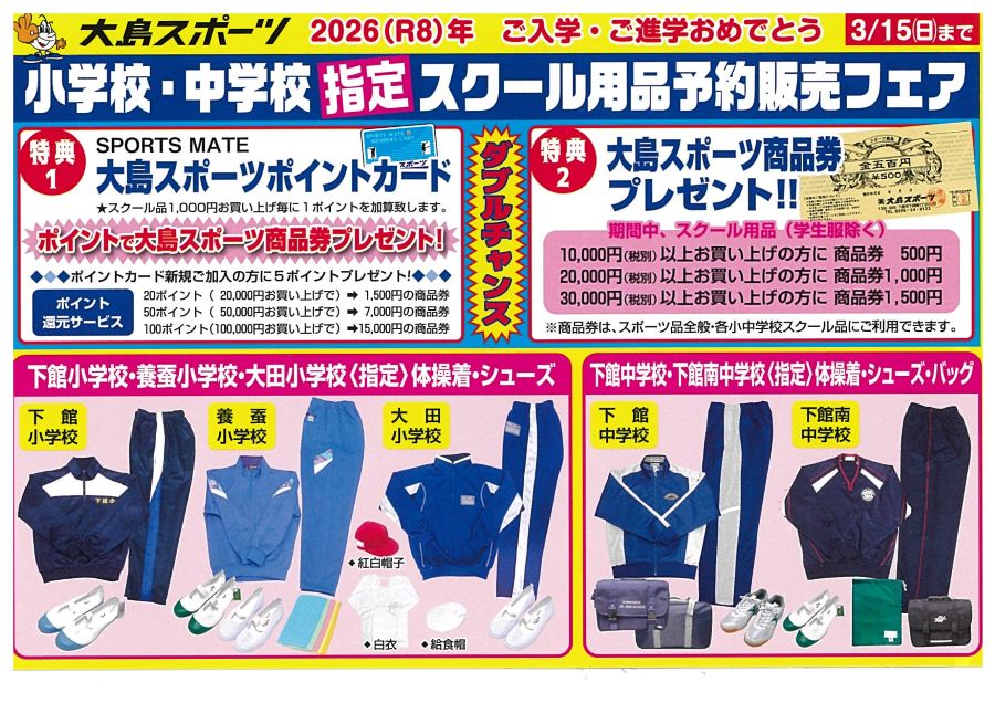 2026年度 小・中学校指定体操着・シューズ・バック